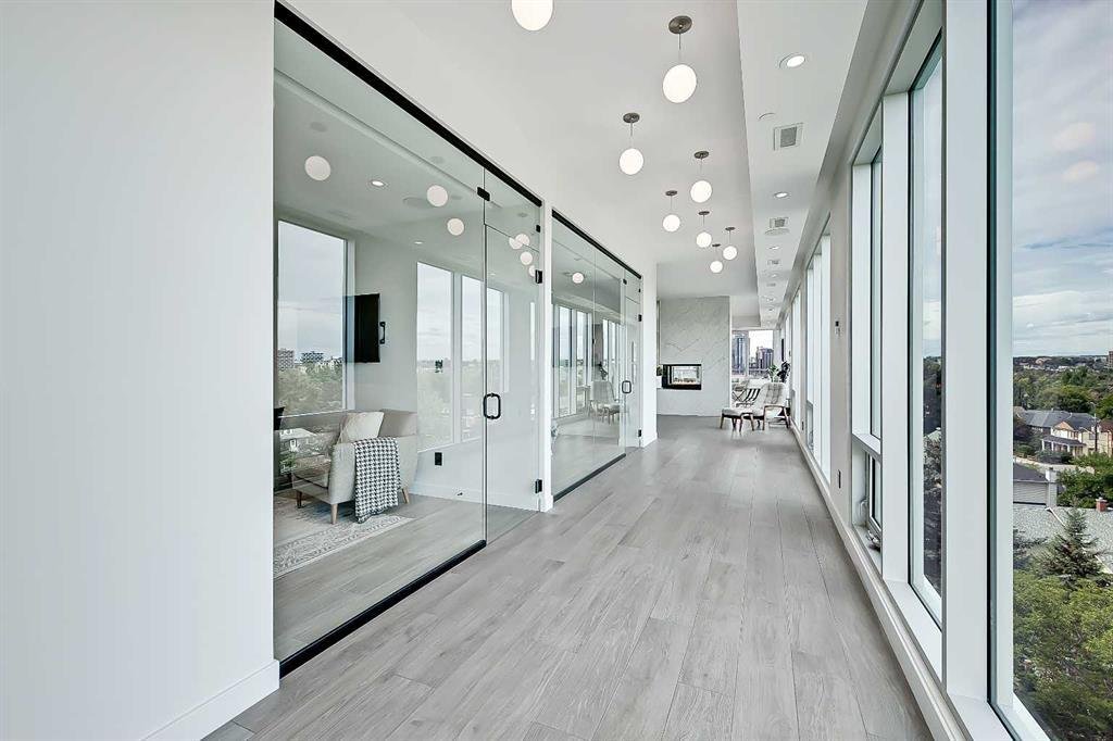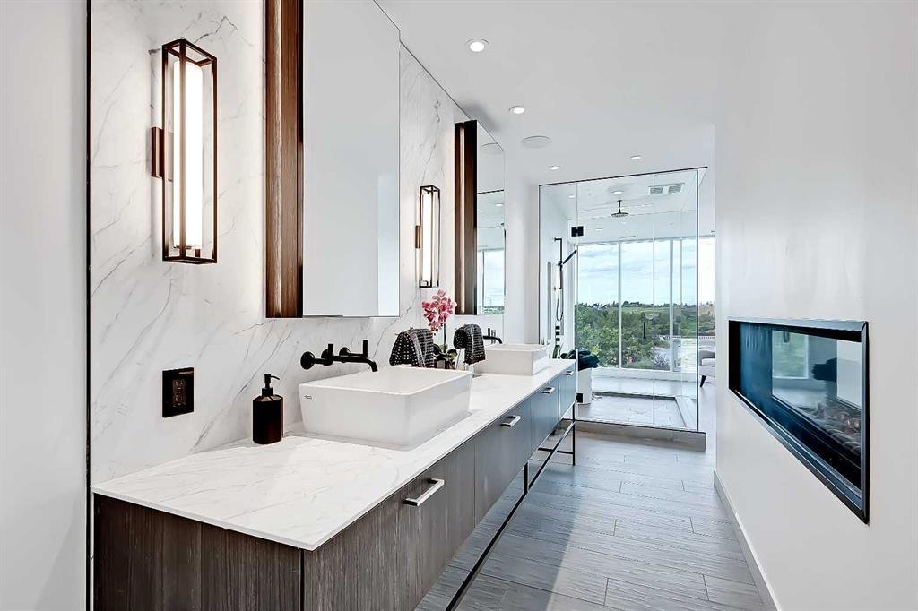 Every room has a view in this penthouse due to creative planning. We pulled the bedrooms off the windows and gave them glass fronts allowing for the hallway to be on the exterior. The rich luxurious finishes coupled with so many features make this penthouse the envy of modern living.